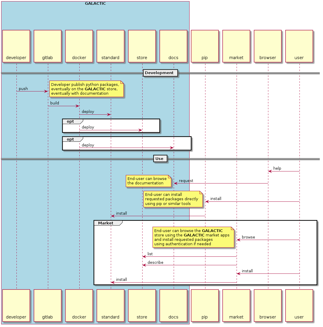 When using GALACTIC, end users can browse the GALACTIC store using the GALACTIC market CLI (command-line interface) and GALACTIC market GUI (graphical user interface) tools to identify which packages are required for their specific use cases.